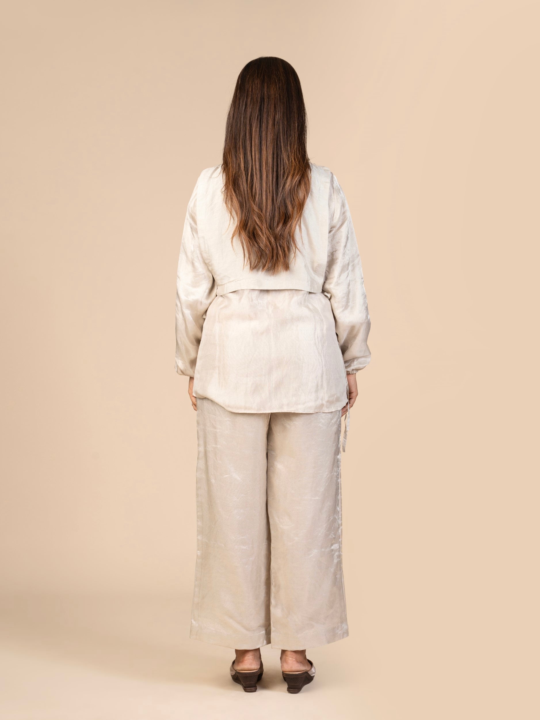 Silver Co-ord Set with Full-Sleeve Shirt, Wide-Legged Pants, and Embroidered Sleeveless Overlay